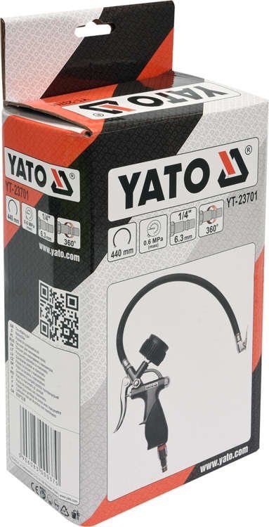 Pistolet pneumatyczny z manometrem i obrotowym przyłączem 1/4" YATO YT-23701, stworzony do precyzyjnego pompowania i kontroli ciśnienia w różnego rodzaju instalacjach i urządzeniach technicznych.