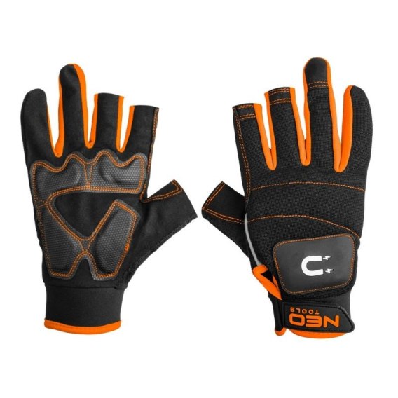 Profesjonalne rękawice robocze NEO TOOLS GD014 zaprojektowane dla precyzyjnych zadań. Trzy odsłonięte opuszki palców umożliwiają dokładne manipulowanie śrubkami i narzędziami, magnes na grzbiecie dłoni przytrzymuje metalowe elementy w zasięgu ręki.
