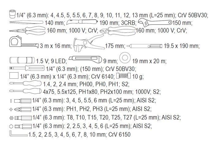 Każdy element został wykonany z wysokogatunkowej stali CrV 6150, CrV 50BV30 oraz S2, a narzędzia izolowane są certyfikowane do pracy pod napięciem 1000 V (VDE).
