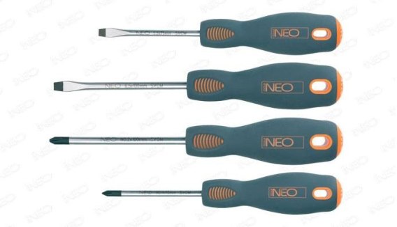 Zestaw wkrętaków zawiera 4 wkrętaki: płaskie i krzyżowe.