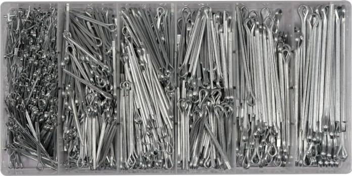 Zawleczki proste x1000 (1.5x25 mm x380, 2.4x25 mm x240, 2.4x38 mm x140, 3x32 mm x115, 3x50 mm x75, 4x60 mm x50)